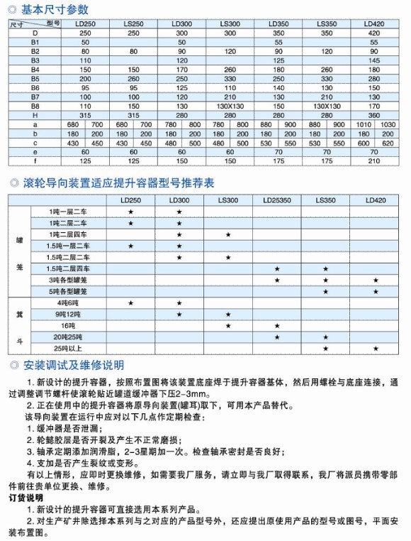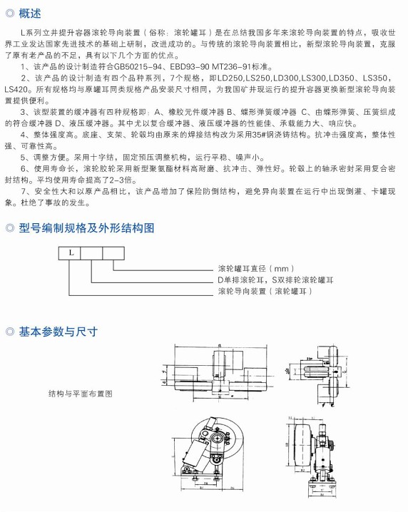 2.該產(chǎn)品的設(shè)計(jì)制造有四個(gè)品種系列,7個(gè)規(guī)格,即:LD250,LD300,LS300,LD350,LS350,LS25,LS420。所有規(guī)格均與原罐耳同類規(guī)格產(chǎn)品安裝尺寸相同,為我國礦井現(xiàn)運(yùn)行的提升容器更換新型滾輪導(dǎo)向裝置提供便利。