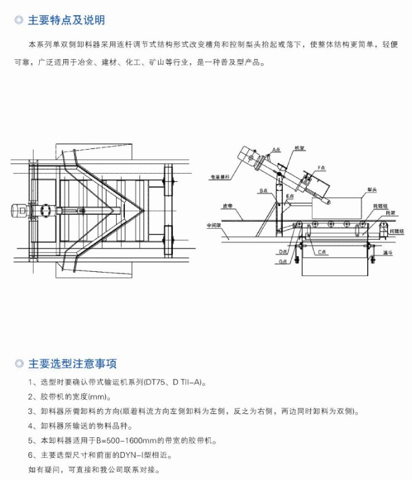 DYNT型單雙側耐磨式犁式卸料器,是以電液推桿為動力源,工作時通過推桿伸出驅動桿,帶動框架前進完成機頭下落,并支撐起平托輥組,使膠帶工作面平直,機頭下沿與膠帶面貼合緊密,將膠帶上物料寫入斗中,送到需要場所,卸料完畢后,啟動電液推桿而縮回驅動桿,帶動框架后退,犁頭上抬,可變托輥組由平行變回槽形,讓物料平穩通過。(電液推桿的動作原理見推桿部分)